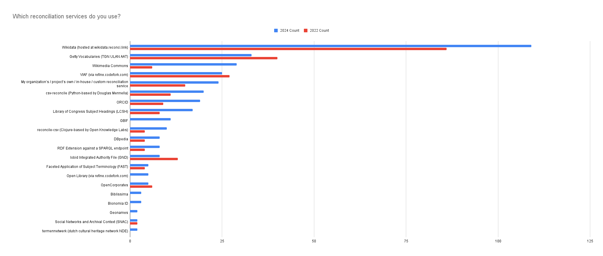 In 2024, reconciliation services continued to rise in popularity, with over 30 endpoints reported. OpenRefine comes with Wikidata as the default reconciliation server, which remains the most used, boasting 109 users (or 43.95% of OpenRefine users). The Commons extension increased in popularity, growing from 6 users in 2022 to 29 users in 2024, and became the second most used endpoint.